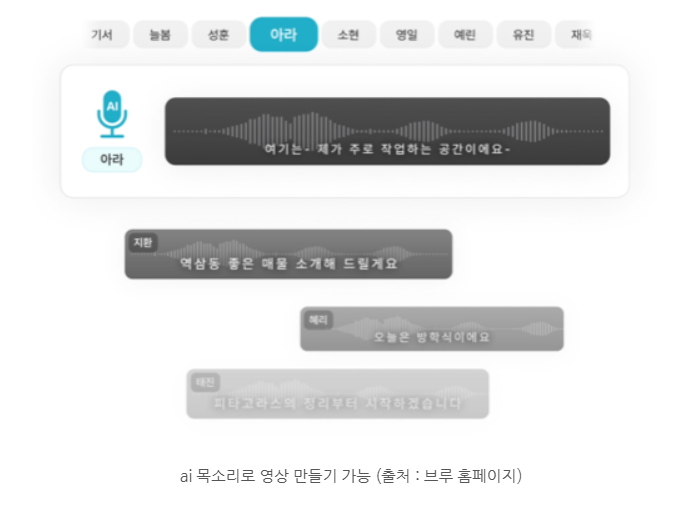 직접 목소리를 녹음하기 부담스럽다면 AI 목소리 기능을 쓸 수 있습니다. 약 200여 종의 AI 성우 목소리를 제공하며, 성별과 연령대, 언어를 선택할 수 있습니다. 무료 버전에서도 38종의 AI 목소리는 제한 없이 사용 가능합니다.